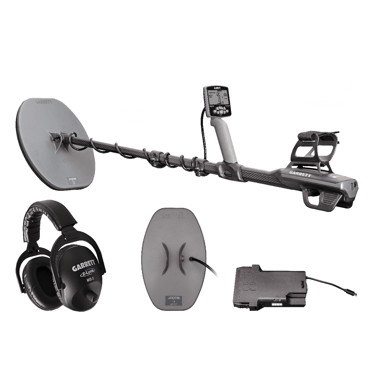 El paquete estándar Axiom (PN 1142720) incluye detector de inducción de pulsos Axiom, auriculares inalámbricos MS-3 Z-Lynk, bobina de búsqueda DD de 13”, bobina de búsqueda Mono de 11”, paquete de viaje blando, paquete de refuerzo de batería Axiom, cables de carga.
